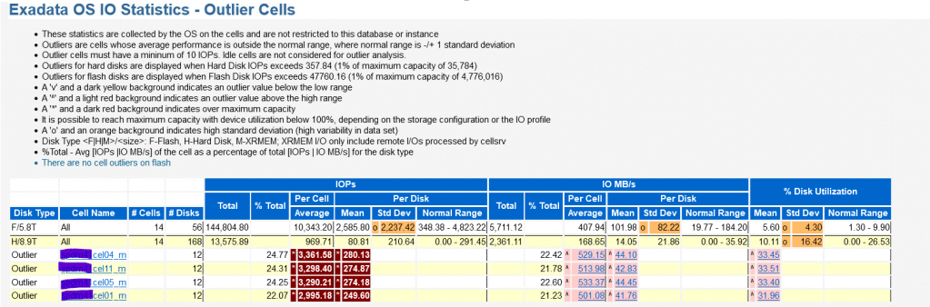 However, degraded flash cache can affect database I/O performance, especially during periods of high I/O activity when more cache is needed. This performance impact may be evident in AWR reports under the ‘Exadata OS IO Statistics – Outlier Cells’ section. In the case study below, degraded flash cache was observed across four different cell storage units, highlighting the potential scope of the issue.